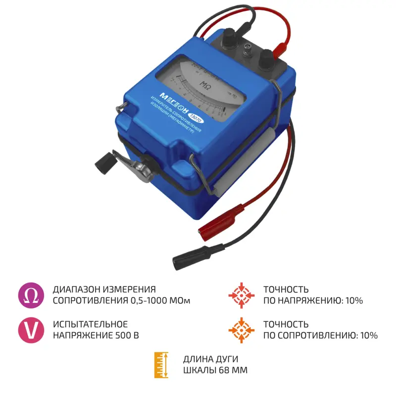 Испытательное напряжение в 500 В обеспечивает надежное выполнение измерений, позволяя точно оценивать состояние изоляции. Погрешности по напряжению и сопротивлению составляют 10%, что гарантирует достаточный уровень точности для большинства практических приложений. Длина дуги шкалы, равная примерно 68 мм, облегчает считывание значений, что особенно важно в условиях, когда время имеет значение.